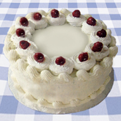 Vanilla sponge cake covered in cream cheese icing. Center is filled with a layer of whip-cream and cherries. |