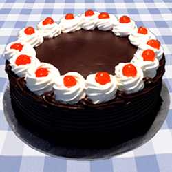 Chocolate sponge cake covered in rich chocolate icing. Center is filled with a layer of whip-cream and cherries. |