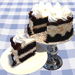 Chocolate sponge cake covered in coconut icing and toasted coconut. Center is filled with whip-cream and coconut icing. |