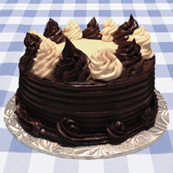 Chocolate sponge cake covered in chocolate and mocha icing. Center is filled with a layer of mocha icing. |