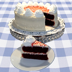 Red Velvet sponge cake covered in a smooth, less sweet cream cheese icing. Center is filled with cream cheese icing. |