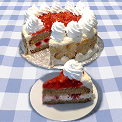 Vanilla sponge cake covered in toasted almonds. Center is filled with a layer of whip-cream and strawberries. |