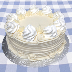 Vanilla sponge cake covered with vanilla icing. Center is filled with a layer of whip-cream and vanilla icing. |